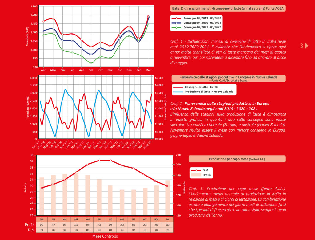 Analizzando i grafici della situazione italiana (graf. 1 e 3) è evidente che i mesi di agosto, settembre, ottobre e novembre sono quelli con la minore produzione. Andamento opposto nell’emisfero australe (in particolar modo estrapolando i dati di consegna in Nuova Zelanda) sono i più produttivi dell’anno (graf. 2).