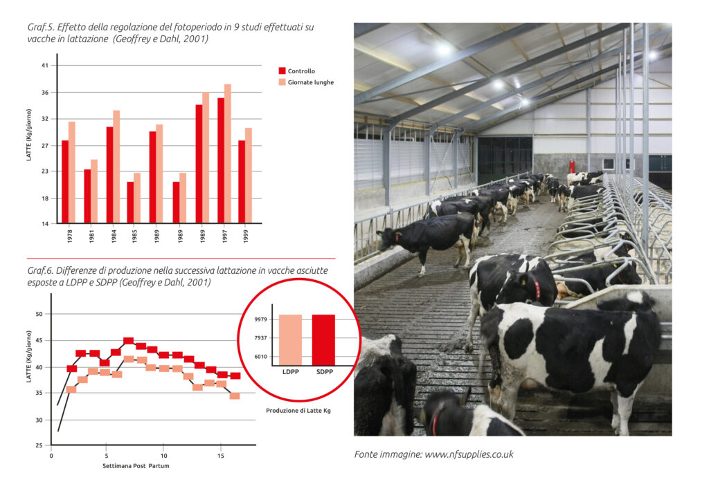 Durante la lattazione la maggior produzione di latte avviene quando la luce del giorno è in aumento, in modo significativo quando le ore di luce superano le 14 ore. Infatti, l’esposizione alla luce non permette la secrezione della melatonina per la maggior parte della giornata e favorisce la secrezione di prolattina e IGF-1, due ormoni che influenzano l’attività della ghiandola mammaria. Le ricerche hanno dimostrato un aumento di produzione in vacche in latte esposte a fotoperiodo lungo rispetto ad animali in condizioni naturali.