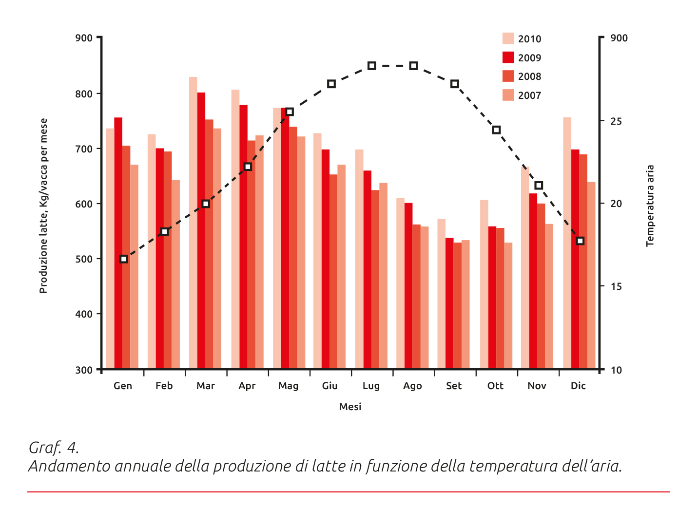 È noto come il rallentamento produttivo e la diminuzione del latte nei mesi estivi sia una combinazione di condizioni ambientali sfavorevoli (caldo e umidità) e l’allungamento dei giorni medi di lattazione (graf. 3).