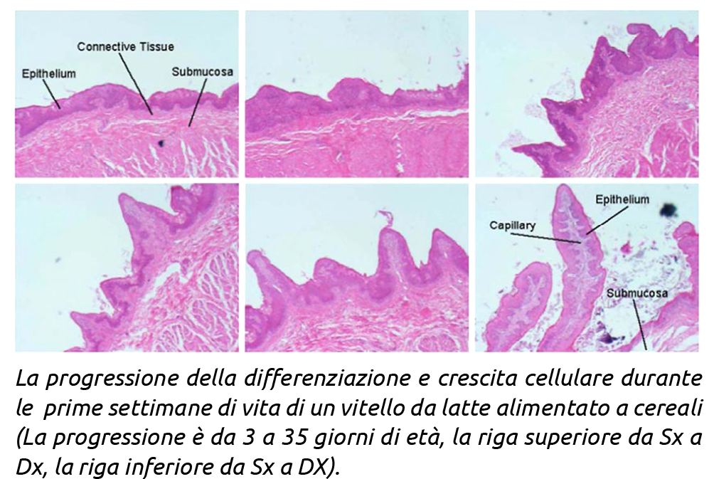 La fermentazione acetica promossa dai foraggi ha una scarsa capacità di stimolo sulla crescita epiteliale. Pertanto gli alimenti utilizzati nello svezzamento come il latte, i concentrati e i foraggi influenzano, ognuno in modo differente, la velocità e l’estensione della crescita dell’epitelio ruminale.