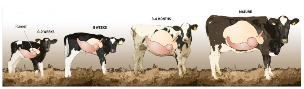 L’abomaso dei vitelli appena nati è l’unico stomaco completamente sviluppato e funzionale ed è anche l’organo digestivo più importante per i vitelli alla nascita. La digestione di grassi, carboidrati e proteine dipende principalmente dagli enzimi digestivi secreti dall’abomaso e dall’intestino tenue, che è simile al sistema digestivo degli animali monogastrici. Nel corso del tempo, con l’aumento dell’apporto di alimenti solidi, il rumine inizia a svilupparsi e a svolgere ruoli digestivi più importanti.