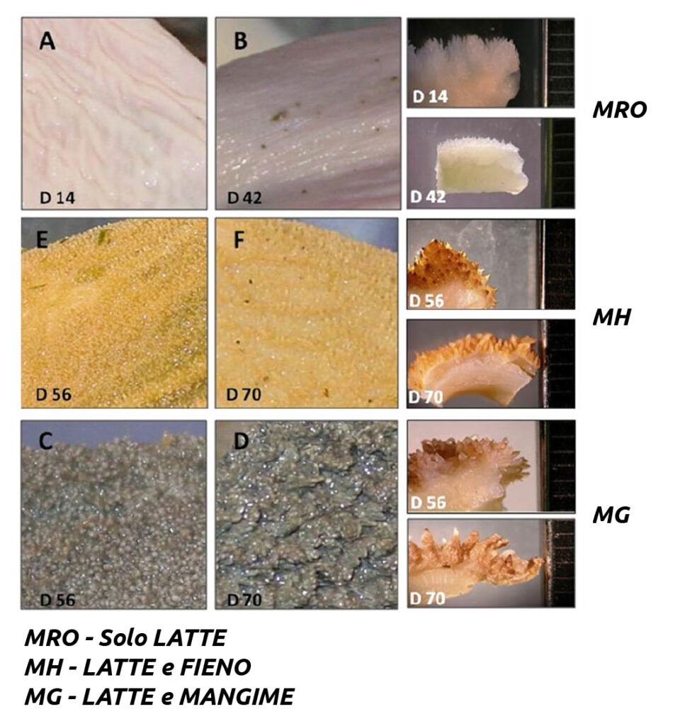 La pratica di introdurre il foraggio durante lo svezzamento è stata a lungo sconsigliata per il suo scarso valore energetico e per la sua proprietà di spostare le fermentazioni verso l’acetato, limitando in tal modo lo sviluppo delle papille. È anche vero però, che l’assunzione di mangime con poca fibra e ricco di cereali fermentescibili può portare ad un abbassamento del pH e favorire una ridotta motilità del rumine, che possono causare ipercheratosi e paracheratosi dell’epitelio ruminale.