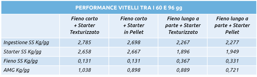 Recenti studi hanno rilevato che l’integrazione del mangime starter con foraggio macinato corto migliora l’ingestione l’accrescimento e la digeribilità della razione. Gli alimenti con fibra strutturata stimolano la produzione di saliva durante la masticazione e la ruminazione che forniscono urea e minerali, come il bicarbonato di sodio, che aiutano a mantenere la normale crescita e lo sviluppo microbico del rumine. I foraggi grossolani sono importanti per favorire la crescita dello strato muscolare del rumine e per mantenere la salute dell’epitelio.