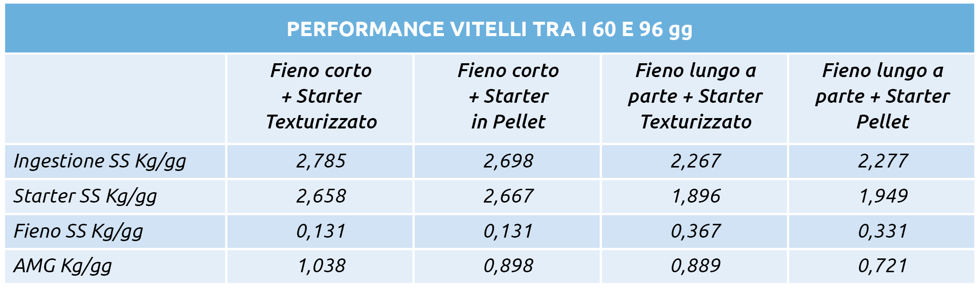 Recenti studi hanno rilevato che l’integrazione del mangime starter con foraggio macinato corto migliora l’ingestione l’accrescimento e la digeribilità della razione. Gli alimenti con fibra strutturata stimolano la produzione di saliva durante la masticazione e la ruminazione che forniscono urea e minerali, come il bicarbonato di sodio, che aiutano a mantenere la normale crescita e lo sviluppo microbico del rumine. I foraggi grossolani sono importanti per favorire la crescita dello strato muscolare del rumine e per mantenere la salute dell’epitelio.