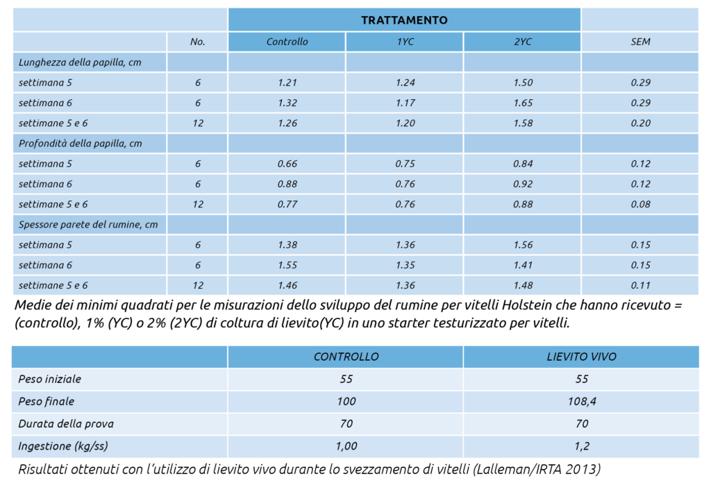 I probiotici intesi come microorganismi o loro derivati hanno dimostrato una interessante azione come stimolo allo sviluppo ruminale. La cellula di lievito, ad esempio, contiene RNA e nucleotidi liberi, aminoacidi, vitamine del gruppo B e molti enzimi. Questi ultimi contribuiscono alla scomposizione ed utilizzazione degli zuccheri, facilitano l’assorbimento del glucosio, partecipano ai processi di formazione dei coenzimi e favoriscono l’attività della microflora ruminale e intestinale, con sensibili miglioramenti del pH, della ingestione e della efficienza digestiva.