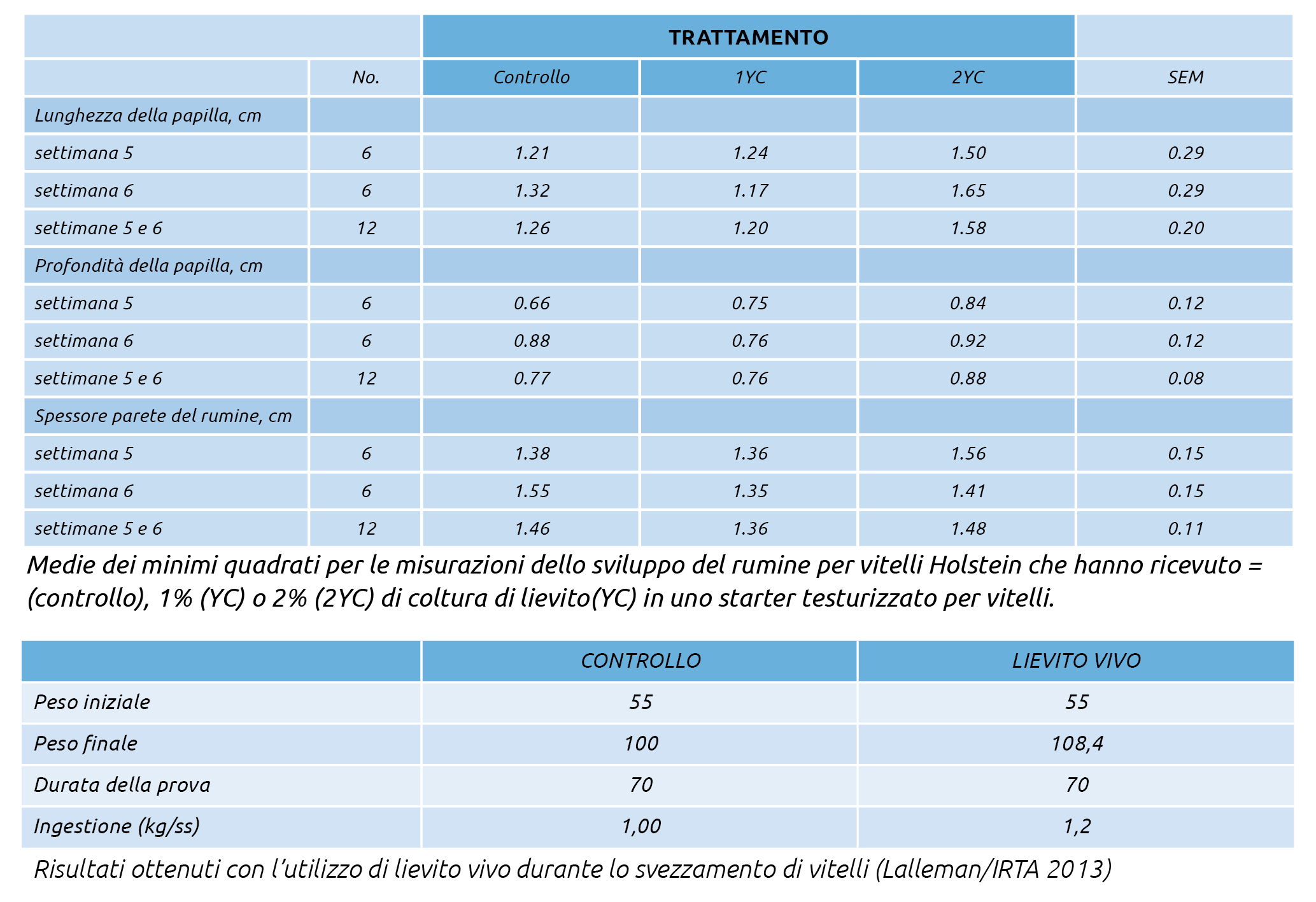 I probiotici intesi come microorganismi o loro derivati hanno dimostrato una interessante azione come stimolo allo sviluppo ruminale. La cellula di lievito, ad esempio, contiene RNA e nucleotidi liberi, aminoacidi, vitamine del gruppo B e molti enzimi. Questi ultimi contribuiscono alla scomposizione ed utilizzazione degli zuccheri, facilitano l’assorbimento del glucosio, partecipano ai processi di formazione dei coenzimi e favoriscono l’attività della microflora ruminale e intestinale, con sensibili miglioramenti del pH, della ingestione e della efficienza digestiva.