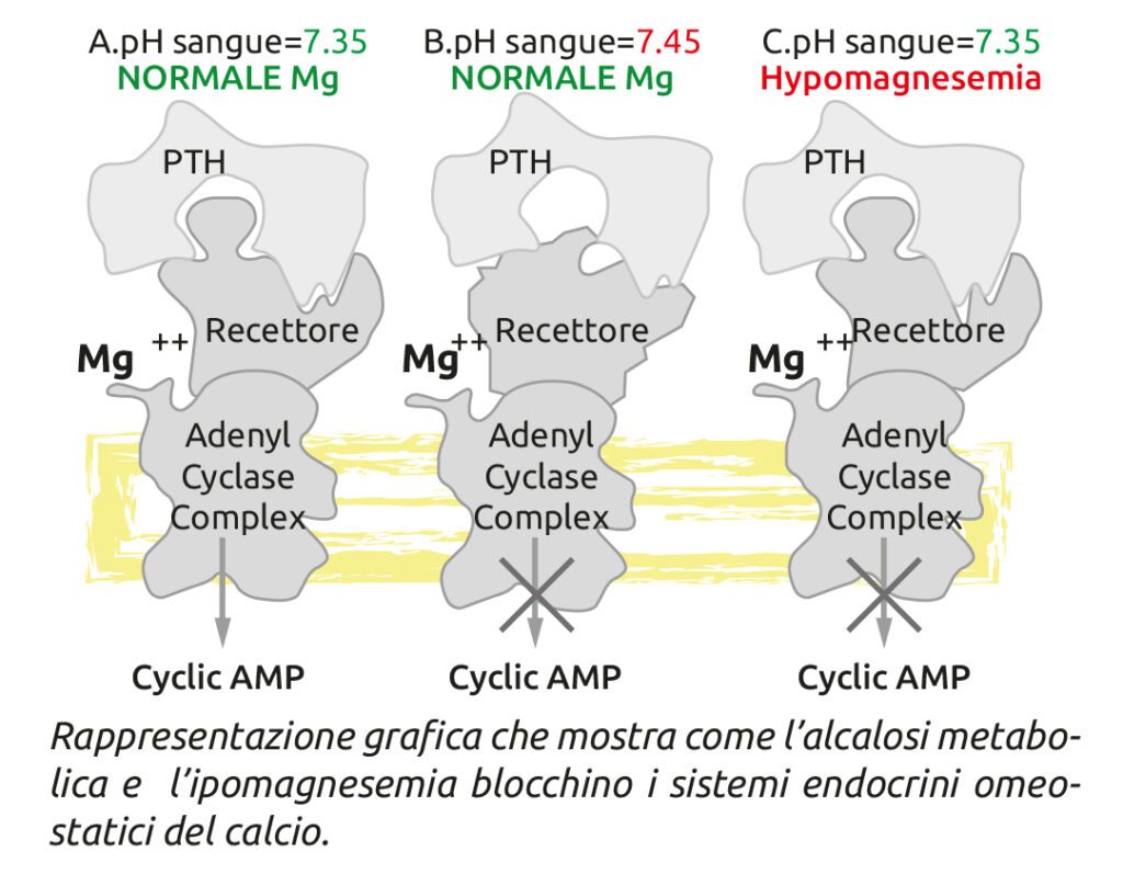 Questi effetti del PTH, congiuntamente a quelli della vitamina D3, si ottengono se c’è la corretta conformazione dei recettori per il paratormone, che si realizza in condizioni di pH fisiologico del sangue ed è alterata e bloccata da situazioni di alcalosi metabolica.