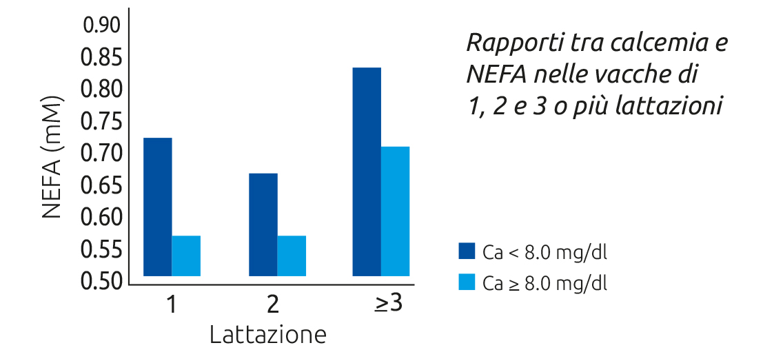Altrettanto importante è però anche occuparsi di preservare al meglio la funzionalità epatica nel periodo di transizione della vacca (a livello epatico avviene il processo di idrossilazione che attiva in senso endocrino la vitamina D), grazie all’utilizzo di fattori lipotropi ed epatoprotettivi (quali colina, metionina, carnitina), tant’è che esiste una stretta correlazione tra valori di calcio e NEFA nel sangue.