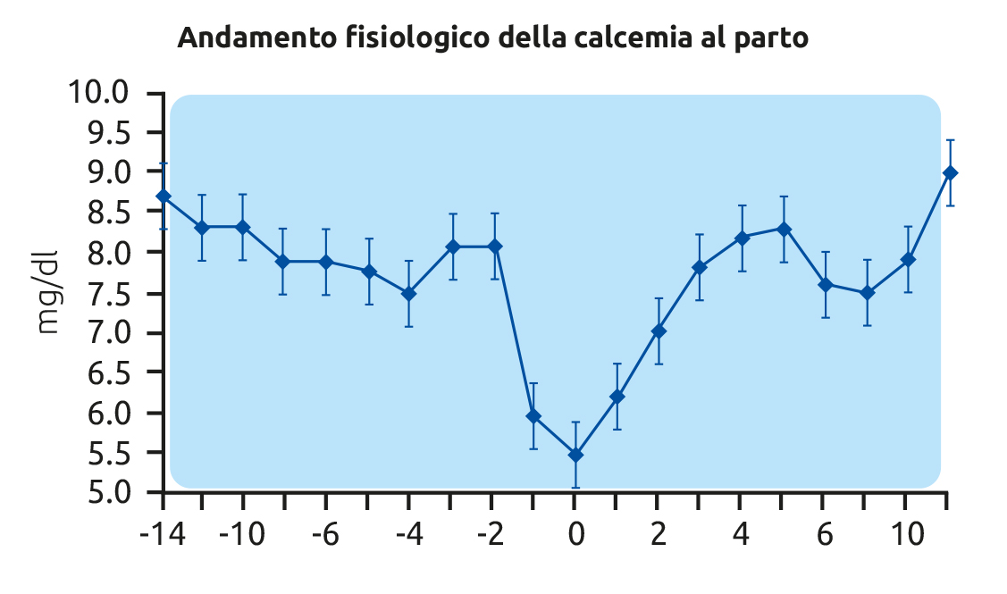Nell’arco delle prime 48-72 ore dopo il parto, il corretto funzionamento del sistema omeostatico che regola la calcemia riporta i valori di calcio, scesi intorno ai 6 mg/dl subito dopo il parto, ai fisiologici valori di 8-8,5 mg/dl.