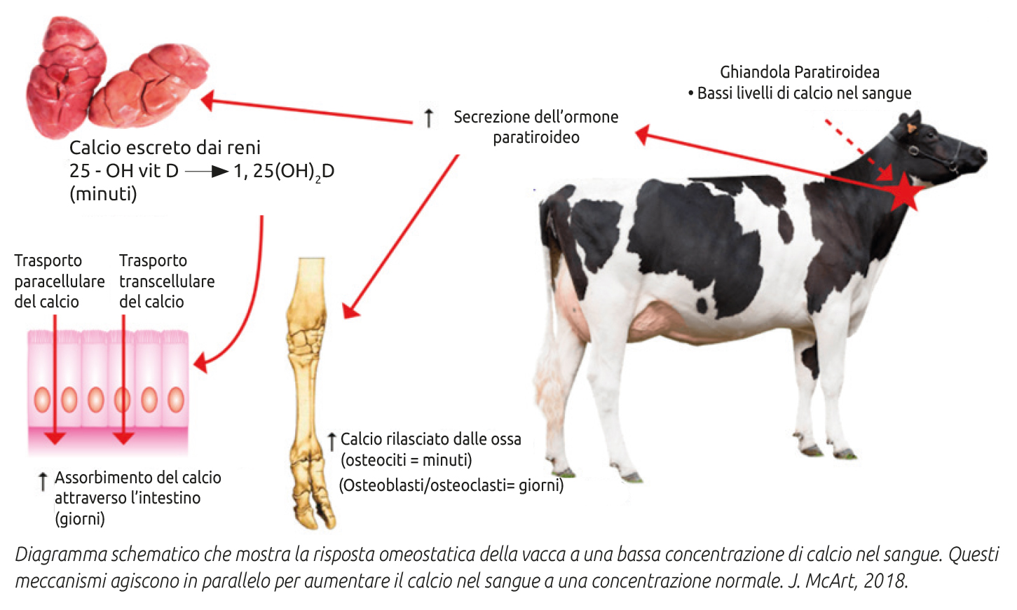 Come precedentemente detto, anche in condizioni ottimali, al parto nella vacca si realizza una situazione di temporanea fisiologica ipocalcemia, a cui cercano di fare fronte i meccanismi omeostatici del calcio dell’organismo.