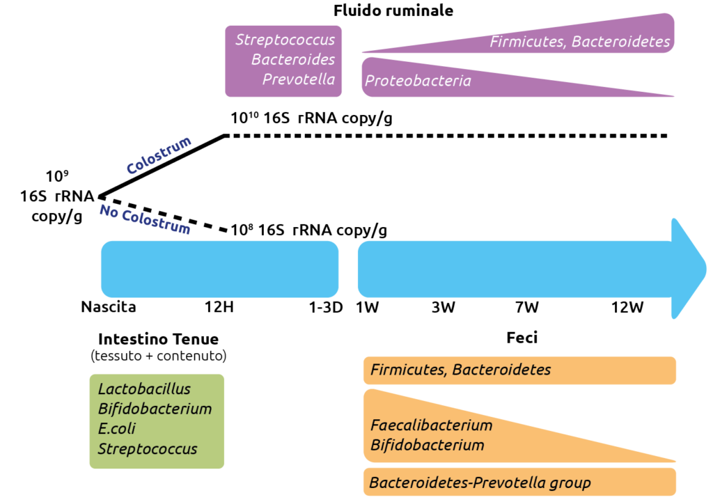 Il microbioma intestinale del vitello è già presente nel feto e, quindi, nel meconio e si modifica con l’avanzare dell’età e in funzione della dieta. Studi recenti hanno, infatti, riportato l’esistenza di un microbiota diversificato nei feti di vitello di età compresa tra 5 e 7 mesi, suggerendo che la colonizzazione dell’intestino bovino con il cosiddetto microbiota “pioniere” potrebbe iniziare già durante la metà della gestazione.