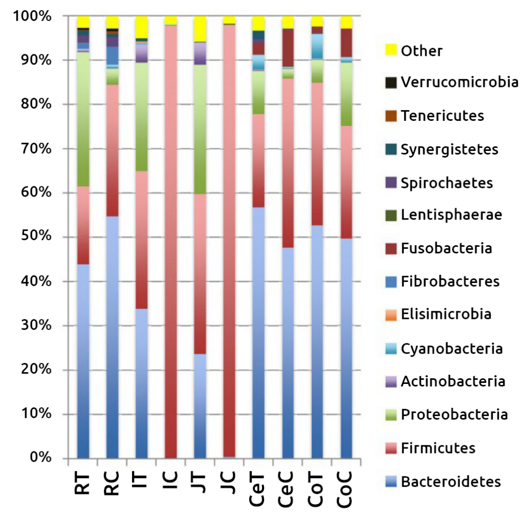 Composizione dei phylum dei batteri intestinali a diversi livelli sia a livello della mucosa che del digesta in tutto il tratto gastrointestinale dei vitelli da latte. RT, tessuto ruminale; RC, contenuto ruminale; JT, tessuto digiunale; JC, contenuto del digiuno; IT, tessuto ileo; IC, contenuto dell’ileo; CeT, tessuto cieco; CeC, contenuto del cieco; CoT, tessuto del colon; CoC, contenuto del colon. Nilusha Malmuthuge et al. ASM Journals