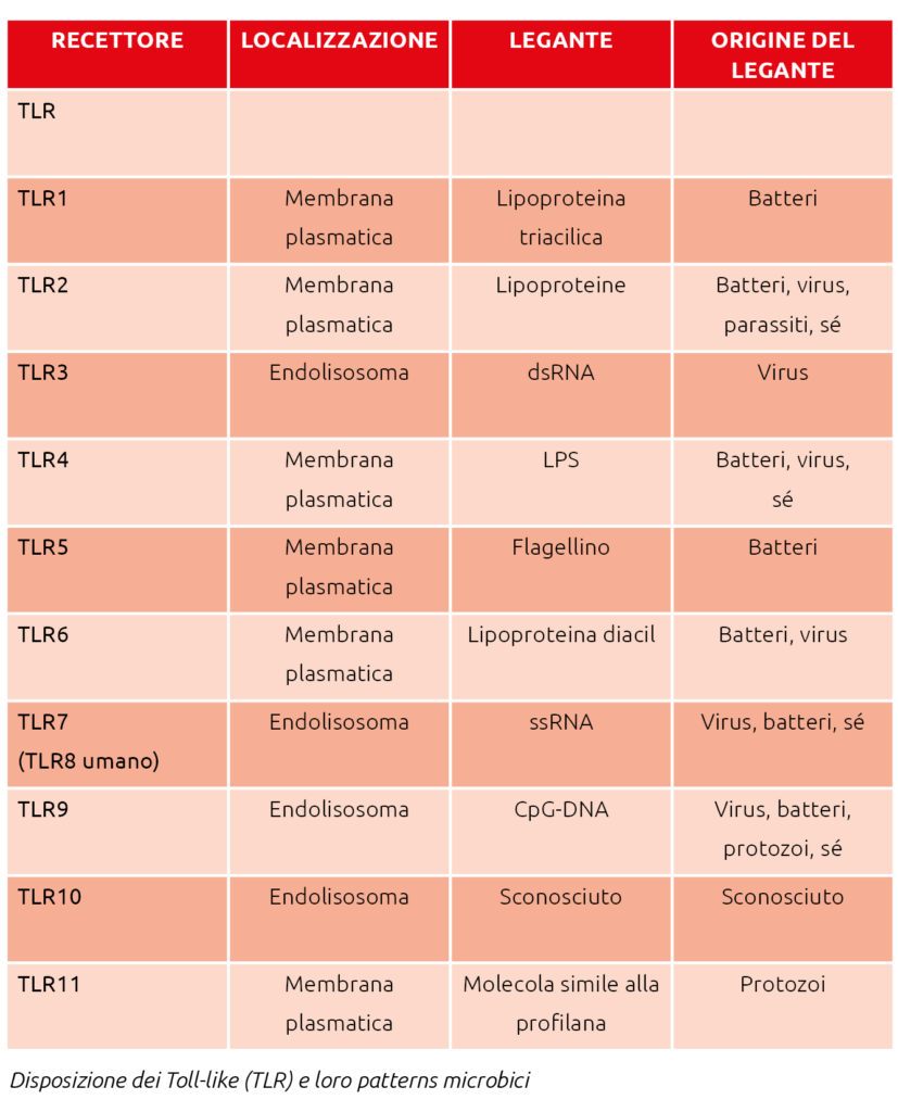 Di questi ne esistono di diversi tipi: recettori Toll-like, RIG-I-like,NODlike e recettori della lectina di tipo C. I Toll-like (TLR) svolgono un ruolo  cruciale nella difesa dell’ospite contro le infezioni microbiche. I patterns microbici riconosciuti dai TLR, tuttavia, non sono esclusivi dei patogeni, ma sono prodotti anche daicommensali. Si ritiene che una risposta  infiammatoria ai batteri commensali venga evitata grazie al riconoscimento di particolari  molecole che rilevano prodotti molecolari dei microrganismi, come il lipopolisaccaride (LPS) e l’acido lipoteicoico (LTA), I TLR funzionano come sensori di infezione microbica e sono fondamentali per l’avvio delle risposte  infiammatorie e di difesa immunitaria.