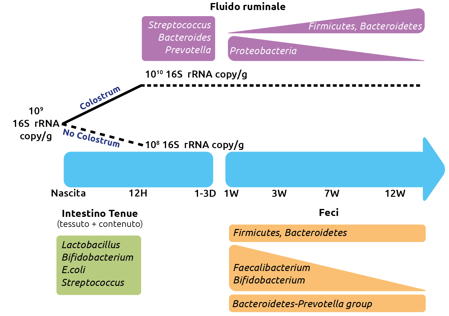 Il microbioma intestinale del vitello è già presente nel feto e, quindi, nel meconio e si modifica con l’avanzare dell’età e in funzione della dieta. Studi recenti hanno, infatti, riportato l’esistenza di un microbiota diversificato nei feti di vitello di età compresa tra 5 e 7 mesi, suggerendo che la colonizzazione dell’intestino bovino con il cosiddetto microbiota “pioniere” potrebbe iniziare già durante la metà della gestazione.