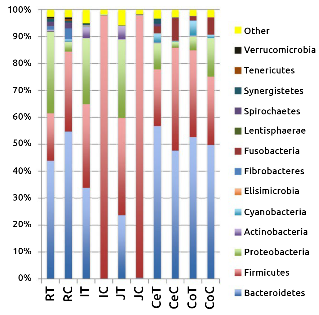 Composizione dei phylum dei batteri intestinali a diversi livelli sia a livello della mucosa che del digesta in tutto il tratto gastrointestinale dei vitelli da latte. RT, tessuto ruminale; RC, contenuto ruminale; JT, tessuto digiunale; JC, contenuto del digiuno; IT, tessuto ileo; IC, contenuto dell’ileo; CeT, tessuto cieco; CeC, contenuto del cieco; CoT, tessuto del colon; CoC, contenuto del colon. Nilusha Malmuthuge et al. ASM Journals