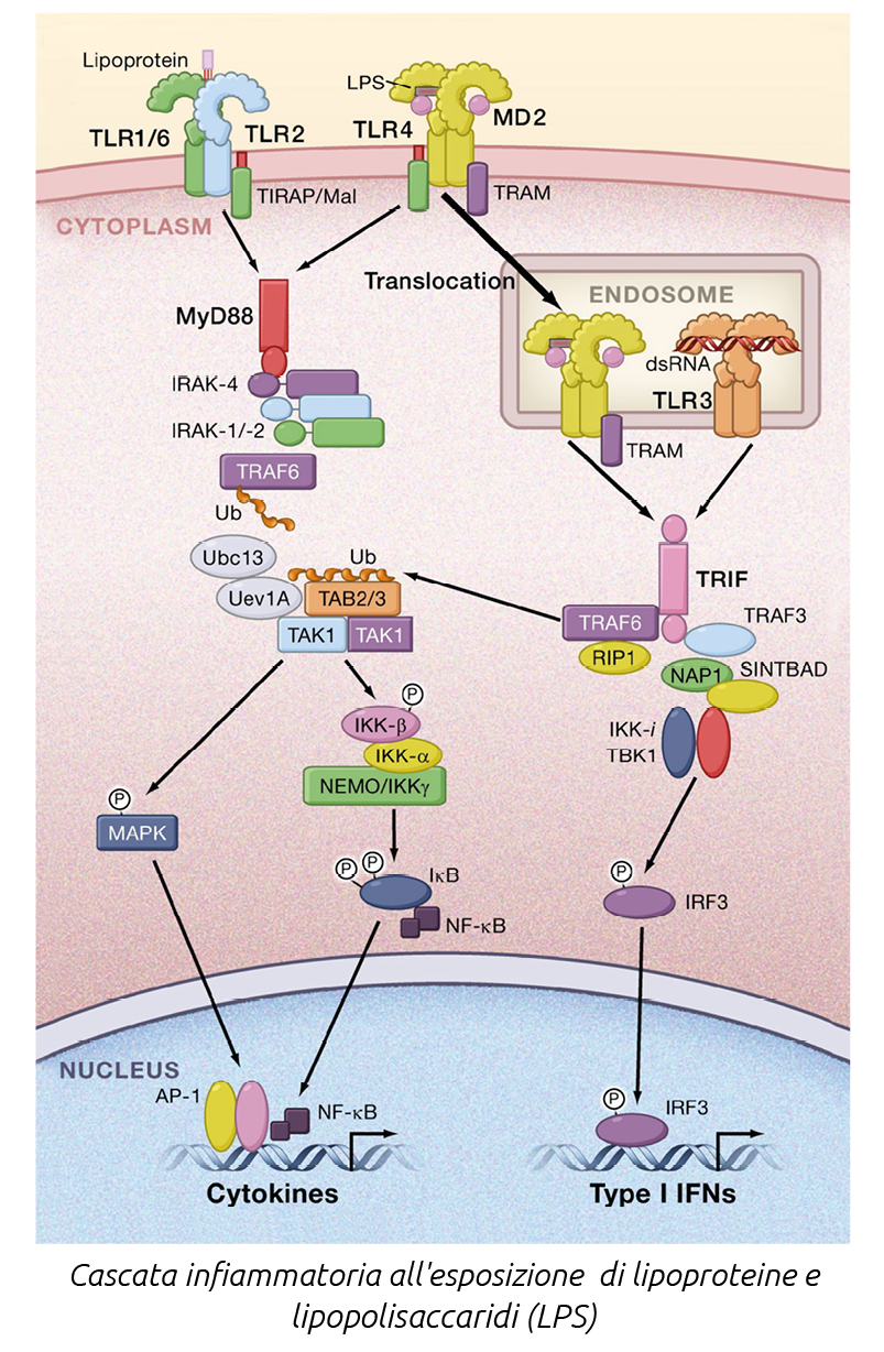 Di questi ne esistono di diversi tipi: recettori Toll-like, RIG-I-like,NODlike e recettori della lectina di tipo C. I Toll-like (TLR) svolgono un ruolo  cruciale nella difesa dell’ospite contro le infezioni microbiche. I patterns microbici riconosciuti dai TLR, tuttavia, non sono esclusivi dei patogeni, ma sono prodotti anche daicommensali. Si ritiene che una risposta  infiammatoria ai batteri commensali venga evitata grazie al riconoscimento di particolari  molecole che rilevano prodotti molecolari dei microrganismi, come il lipopolisaccaride (LPS) e l’acido lipoteicoico (LTA), I TLR funzionano come sensori di infezione microbica e sono fondamentali per l’avvio delle risposte  infiammatorie e di difesa immunitaria.