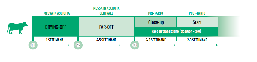 La fase di asciutta è fondamentale per la ricostruzione del tessuto mammario e per la ripresa dell’equilibrio organico delle vacche sottoposte alla intensa attività di lattazione. L’integrazione appropriata permette all’animale di ricostituire le scorte di minerali e vitamine e di prepararsi alla lattazione successiva. Questo periodo si può gestire con un unico gruppo, oppure dividendolo in 3 fasi: